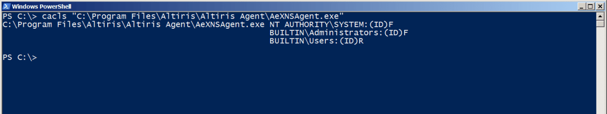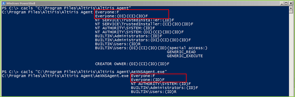 The following screenshots show the permissions applied to the ‘Altiris Agent’ folder and the AeNXSAgent.exe service binary, before modifying the mount point to overwrite the permissions: