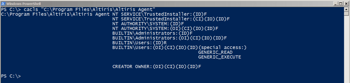 We noticed that folders within the Altiris file structure had the ‘Everyone – Full Control’ permission applied. These folders seemed to contain fairly benign content, such as scan configuration files and XML files, from what we believed to be the inventory scan or output from a recent task. These folder and file permissions were found using a simple PowerShell one liner which allowed us to perform an ACL review on any Windows host, using only the tools on that host. An example of this one liner is as follows: