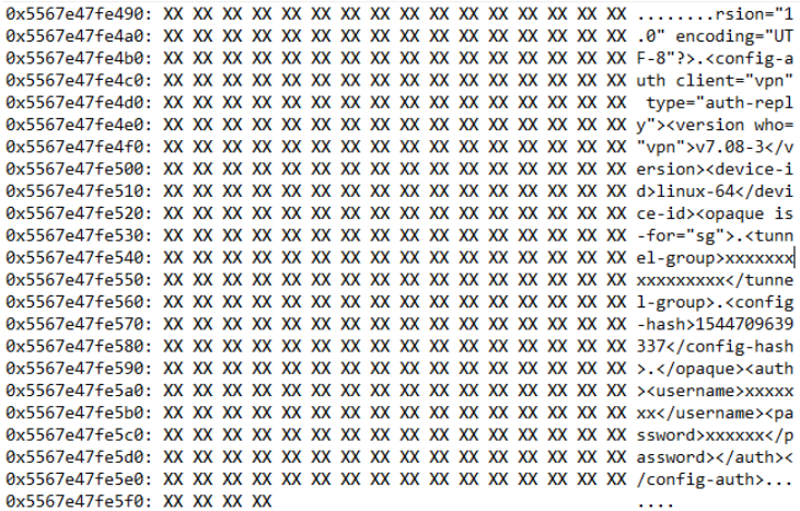 At the end of 2018, I installed the open source OpenConnect client in order to connect to a VPN, and thought I would have a poke around in memory to see if this too suffered from a similar issue.